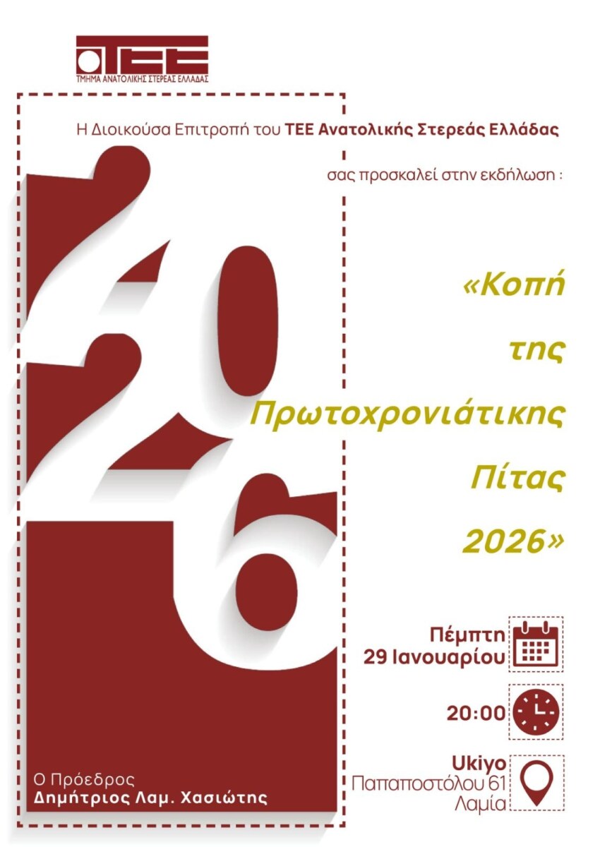 Ο πρόεδρος Δημήτρης Χασιώτης και τα μέλη της Διοικούσας Επιτροπής του ΤΕΕ|ΤΑΣΕ προσκαλούν τα μέλη του Τμήματος στην εορταστική εκδήλωση για την κοπή της πρωτοχρονιάτικης πίτας, που θα πραγματοποιηθεί την Πέμπτη 29 Ιανουαρίου 2026 και ώρα 20:00, στο Ukiyo, Παπαποστόλου 61 στη Λαμία.