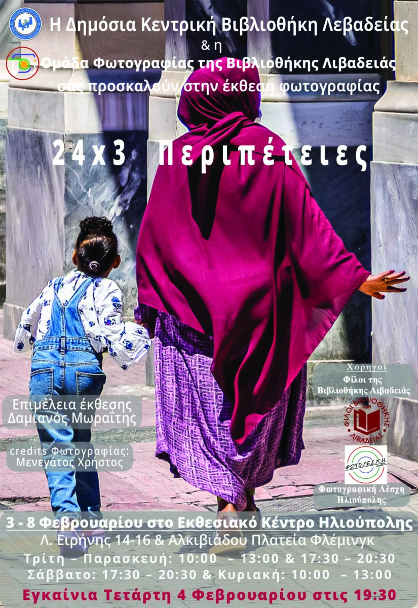 Η Δημόσια Κεντρική Βιβλιοθήκη Λεβαδείας και η Ομάδα Φωτογραφίας της Βιβλιοθήκης Λιβαδειάς, σας προσκαλούν στην Έκθεση Φωτογραφίας με τίτλο «24×3 Περιπέτειες», που διοργανώνεται, στο Εκθεσιακό Κέντρο Ηλιούπολης, με την υποστήριξη του συλλόγου «Φίλοι της Βιβλιοθήκης Λιβαδειάς» και της «Φωτογραφικής Λέσχης Ηλιούπολης».