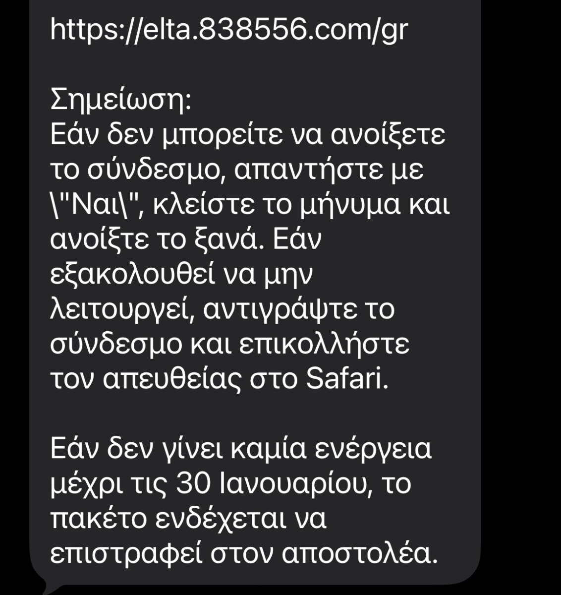 Η απάτη δε σταματά εκεί. Η συνέχεια του μηνύματος παραθέτει ένα σύνδεσμο στον οποίο υποτίθεται ο πολίτης πρέπει να περιηγηθεί για να παραλάβει το πακέτο.