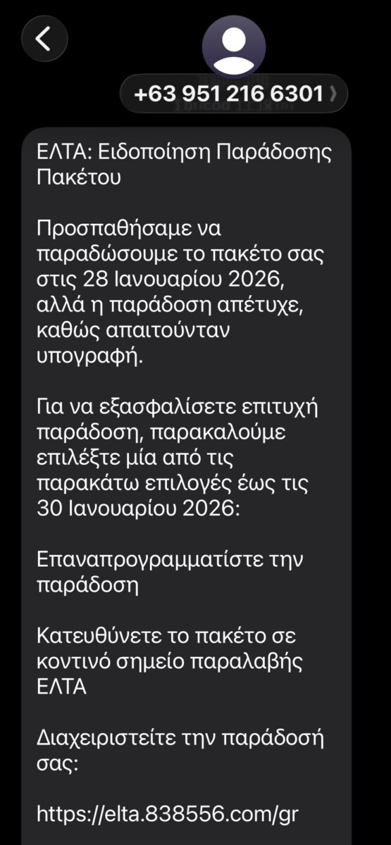 Νέο περιστατικό απάτης μέσω μηνύματος σε κινητό τηλέφωνο σημειώθηκε σε πολίτη της Λαμίας. Άγνωστος αριθμός (και μάλιστα ξεκινώντας με τα ψηφία +63), προσποιούμενος τα ΕΛΤΑ, αναφέρεται σε προσπάθεια της δήθεν υπηρεσίας να παραδώσει ένα πακέτο, χωρίς επιτυχία καθώς, όπως αναφέρει, απαιτούνταν υπογραφή.