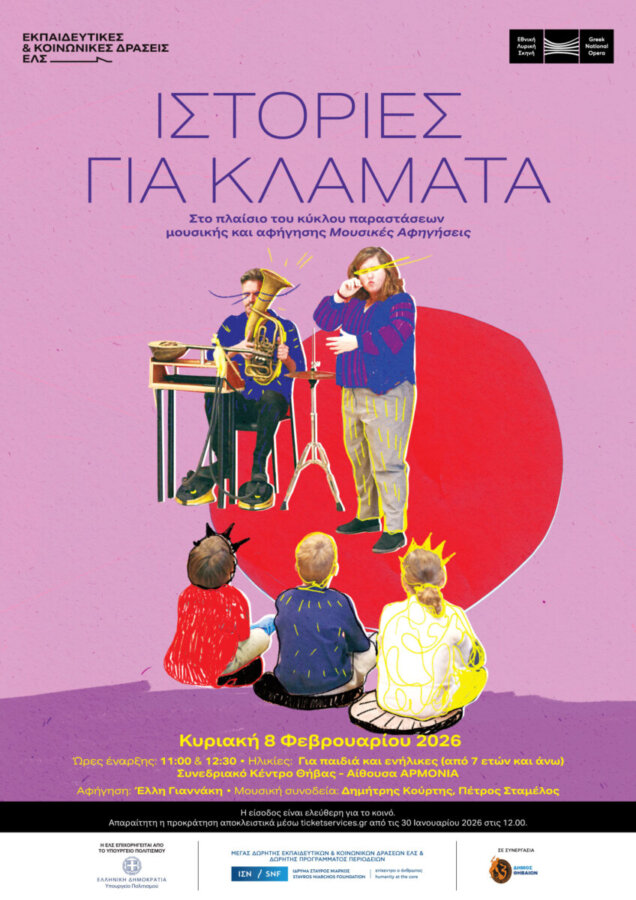 Το φετινό ταξίδι των Μουσικών Αφηγήσεων με τις Ιστορίες για κλάματα κάνει στάση στη Θήβα για δύο μοναδικές παραστάσεις, στις 8 Φεβρουαρίου 2026, στις 11:00 και στις 12:30, στο Συνεδριακό Κέντρο Θήβας.