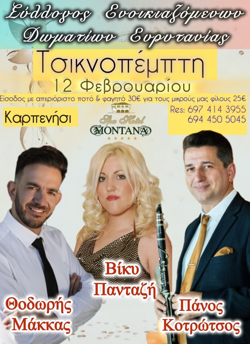 Πέμπτη 12 Φεβρουαρίου, ελάτε να τσικνίσουμε και να χορέψουμε μέχρι το πρωί στο ξενοδοχείο Montana στο Καρπενήσι!