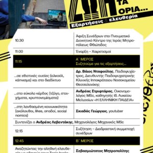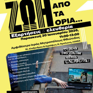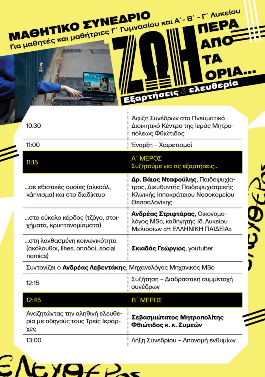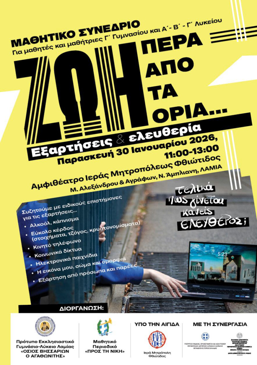 Την Παρασκευή, 30 Ιανουαρίου 2026, στο Αμφιθέατρο του Πνευματικού και Διοικητικού Κέντρου της Ιεράς Μητροπόλεως Φθιώτιδος πραγματοποιήθηκε Μαθητικό Συνέδριο με θέμα: «ΖΩΗ ΠΕΡΑ ΑΠΟ ΤΑ ΟΡΙΑ – Εξαρτήσεις και ελευθερία».