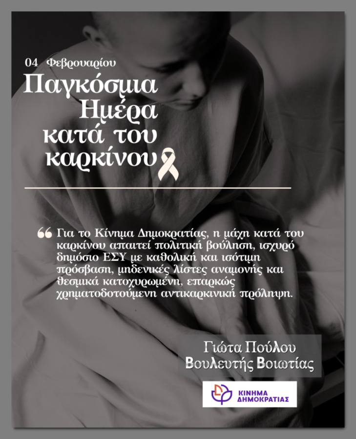 Για το Κίνημα Δημοκρατίας, η μάχη κατά του καρκίνου απαιτεί πολιτική βούληση, ισχυρό δημόσιο ΕΣΥ με καθολική και ισότιμη πρόσβαση, μηδενικές λίστες αναμονής και θεσμικά κατοχυρωμένη αντικαρκινική πρόληψη με κρατική ευθύνη, διαφάνεια, λογοδοσία και επαρκή χρηματοδότηση.