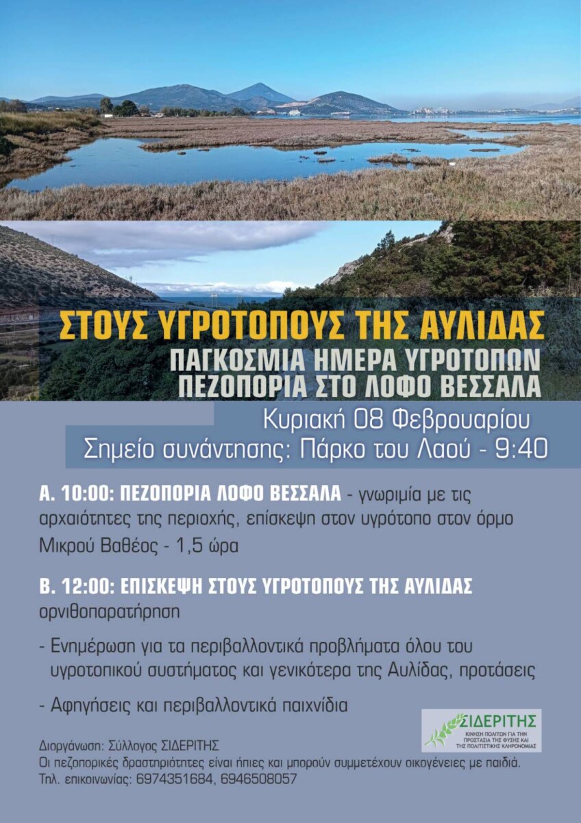 Την Κυριακή 08 Φεβρουαρίου ο Σύλλογος ΣΙΔΕΡΙΤΗΣ στα πλαίσια της παγκόσμιας ημέρας υγροτόπων (στις 2/2 κάθε έτους) θα πραγματοποιήσει στην Αυλίδα τις εξής δράσεις: