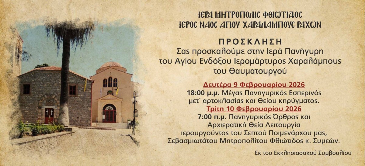 Η Ιερά Μητρόπολις Φθιώτιδος και ο Ιερός Ναός Αγίου Χαραλάμπους Ραχών σας προσκαλούν στην Ιερά Πανήγυρη του Αγίου Ενδόξου Ιερομάρτυρος Χαραλάμπους του Θαυματουργού.