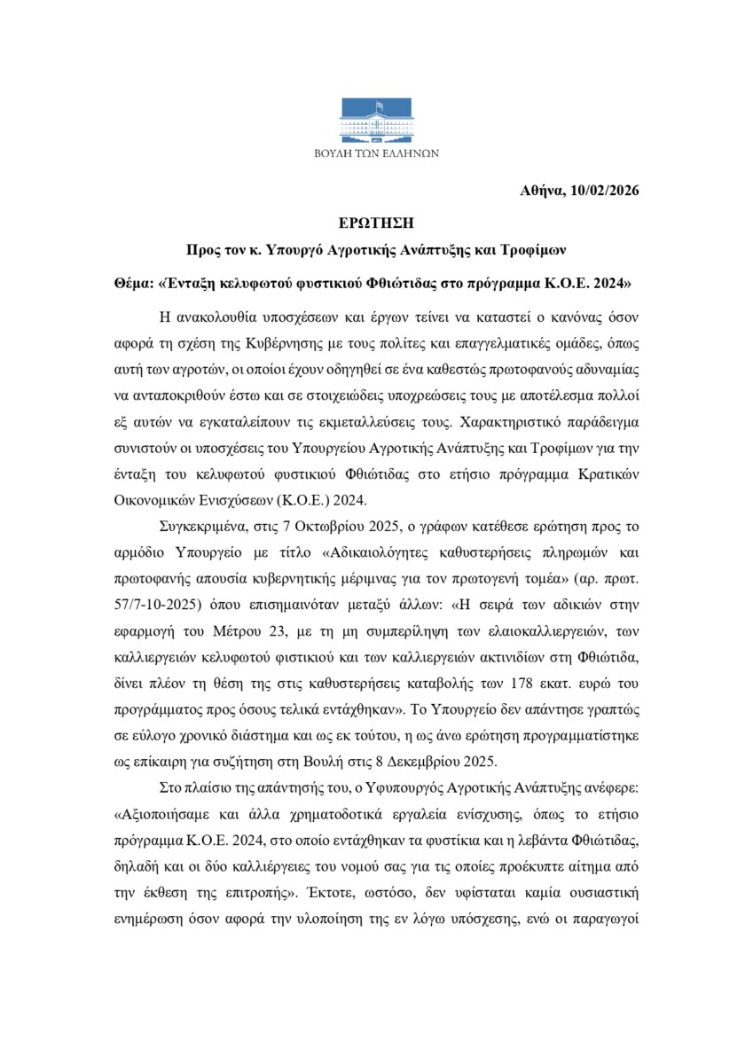 Σε κοινοβουλευτική παρέμβαση προς τον Υπουργό Αγροτικής Ανάπτυξης προχώρησε ο Βουλευτής Φθιώτιδας Γιάννης Σαρακιώτης καλώντας την Κυβέρνηση να τηρήσει τη δέσμευσή της προς τους φυστικοπαραγωγούς της Φθιώτιδας για την ένταξή τους στο ετήσιο πρόγραμμα Κρατικών Οικονομικών Ενισχύσεων (Κ.Ο.Ε.) 2024, όπως είχε υποσχεθεί, καθώς και να εξηγήσει τους λόγους των μέχρι στιγμής καθυστερήσεων.