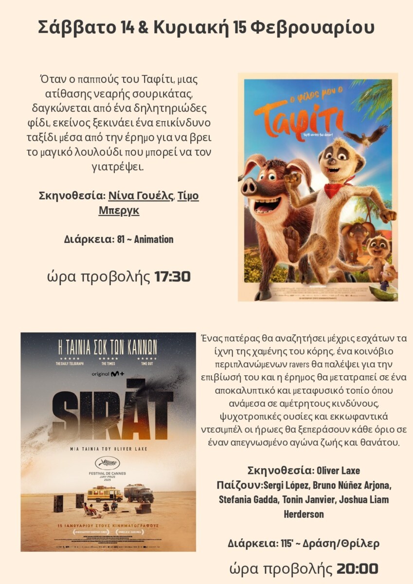 Το πρόγραμμα των προβολών στον Δημοτικό Κινηματογράφο Καρπενησίου για το Σάββατο 14 και την Κυριακή 15 Φεβρουαρίου 2026.