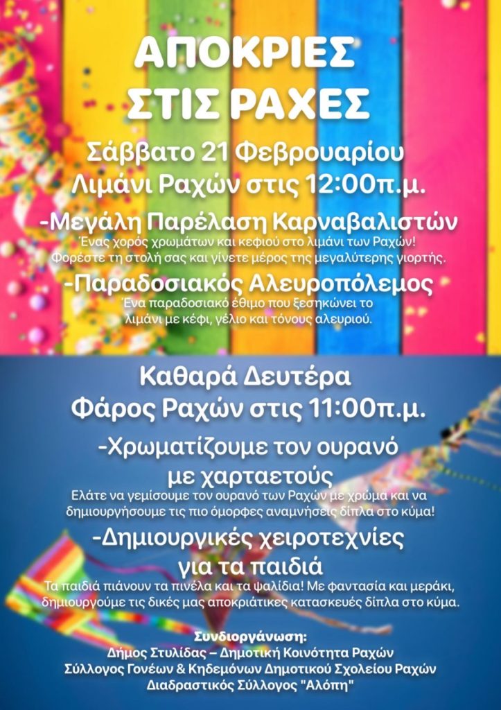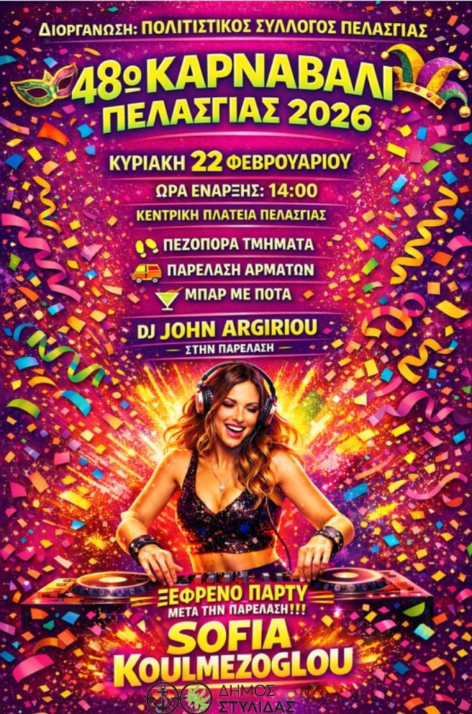 Το καρναβάλι θα ζωντανέψει όχι μόνο στη Στυλίδα, αλλά και στην Πελασγία, στις Ράχες και στη Γλύφα, μεταφέροντας το κέφι και τη χαρά της Αποκριάς σε κάθε γωνιά του Δήμου.