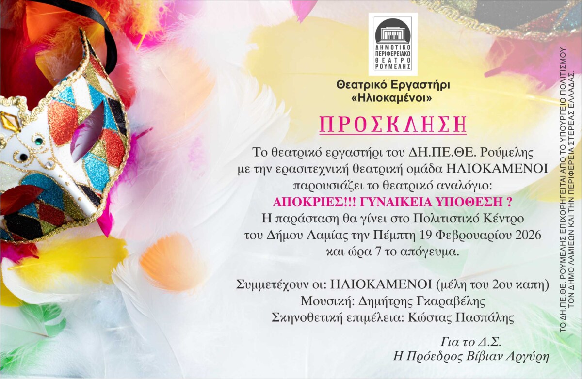 Το Θεατρικό Εργαστήρι του ΔΗΠΕΘΕ Ρούμελης και οι «Ηλιοκαμένοι» παρουσιάζουν το θεατρικό αναλόγιο “ΑΠΟΚΡΙΕΣ!!! ΓΥΝΑΙΚΕΙΑ ΥΠΟΘΕΣΗ?”