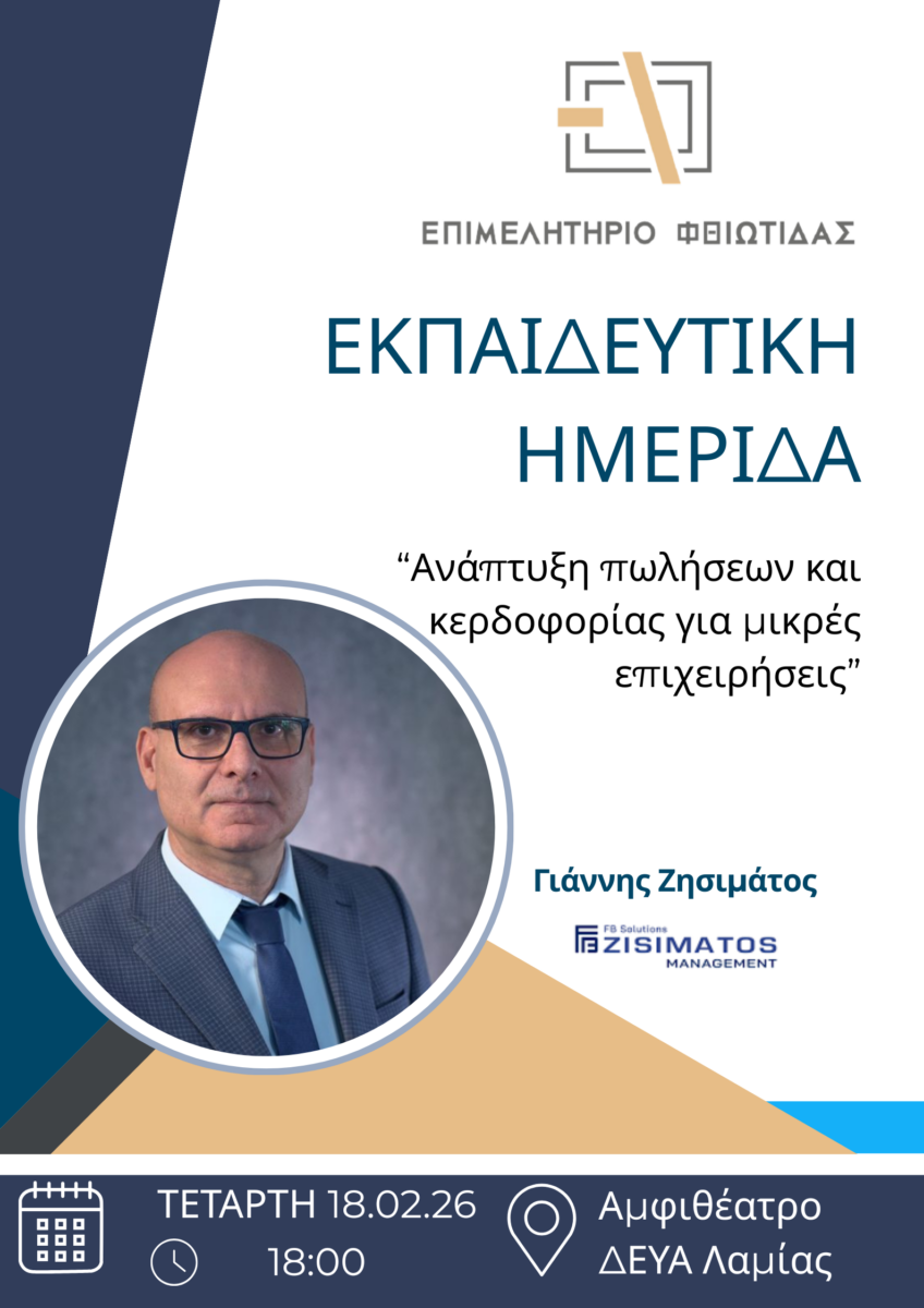 Το Επιμελητήριο Φθιώτιδας διοργανώνει εκπαιδευτική ημερίδα με θέμα: «Ανάπτυξη Πωλήσεων και Κερδοφορίας για Μικρές & Μεσαίες Επιχειρήσεις»