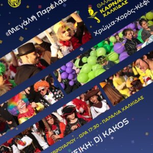 Η φαντασία, το γέλιο και το κέφι συντονίζονται με τους ρυθμούς της μουσικής κι έρχονται να πλημμυρίσουν την παραλία της Χαλκίδας, σκορπώντας ξέφρενη διάθεση, αισιοδοξία, χρώμα και χαμόγελα σε όλους. Μικροί και μεγάλοι καρναβαλιστές φοράνε τις στολές τους, χορεύουν ακούραστα με τις μουσικές επιλογές του DJ Kakos.