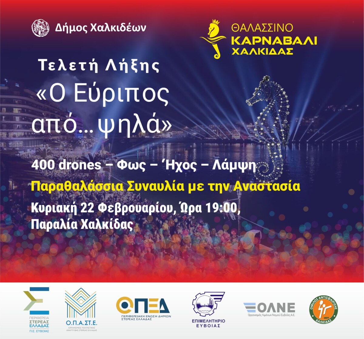 Ο πρωταγωνιστής της Χαλκίδας, ξακουστός Εύριπος, ηρεμεί τα στενά του και έρχεται να μας ταξιδέψει στις ιστορίες του από…ψηλά, με 400 drones να κάνουν την εμφάνισή τους και να δίνουν μια φαντασμαγορική sky παράσταση. Ο Βασιλιάς Καρνάβαλος παραδίνεται στις φλόγες του μέσα στη θάλασσα, ξορκίζοντας κάθε κακό, με το πλήθος των πυροτεχνημάτων να παίρνουν σειρά και να φωτίζουν τον ουρανό όλη της πόλης. Μετά τον Βασιλιά Καρνάβαλο, η σκηνή παίρνει «φωτιά», με την Αναστασία σε μια εκρηκτική συναυλία δίπλα στη θάλασσα, η οποία έρχεται να δώσει το απόλυτο φινάλε με γνωστές επιτυχίες, αστείρευτο κέφι και ανεξάντλητη ενέργεια.