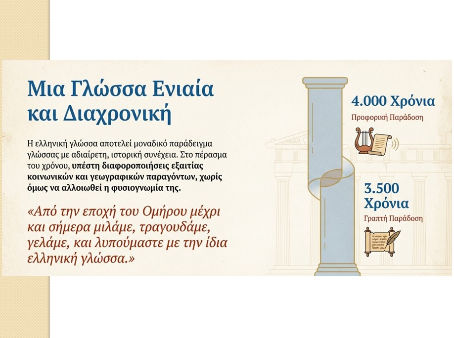 Η εκδήλωση στο Πρότυπο Εκκλησιαστικό Γυμνάσιο – Πρότυπο Εκκλησιαστικό Λύκειο Λαμίας ξεκίνησε με μια εντυπωσιακή παρουσίαση «PowerPoint», η οποία «ξετύλιξε» το νήμα της ιστορίας της Ελληνικής Γλώσσας για περισσότερα από 3.500 χρόνια. Οι μαθητές και οι μαθήτριες περιηγήθηκαν στις απαρχές της Γραμμικής Α΄ και της Γραμμικής Β΄, στη λάμψη της κλασσικής αρχαιότητας, στη βυζαντινή γραμματεία, αλλά και στη σύγχρονη μορφή της Γλώσσας μας. Ιδιαίτερη αίσθηση προκάλεσε η αναφορά στη «Μεγάλη Ελλάδα», όπου η Ελληνική Γλώσσα επιβιώνει μέχρι σήμερα μέσω των «Γκρίκο», αποδεικνύοντας τη μοναδική ανθεκτικότητα και τη ζωτικότητα του Ελληνισμού.