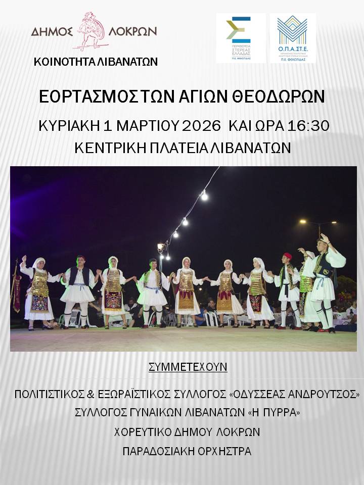 Τοπικοί Σύλλογοι και κάτοικοι των Λιβανατών γιορτάζουν τους Αγίους Θεοδώρους διοργανώνοντας μουσικοχορευτική εκδήλωση στην κεντρική πλατεία Λιβανατών.