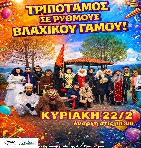 Κυριακή 22 Φεβρουαρίου | Τριπόταμος σε ρυθμούς Βλάχικου Γάμου Ο Τριπόταμος έβαλε τα καλά του και «έσυρε» τον Βλάχικο Γάμο με τα πειράγματα, τις ατάκες και τη σάτιρα που χαρακτηρίζουν το έθιμο και την αποκριάτικη παράδοση του τόπου. Μασκαρέματα, μουσική, χορός και αστείρευτο κέφι γέμισαν το χωριό, με την πομπή και το δρώμενο να παρασύρουν μικρούς και μεγάλους σε μια μεγάλη παρέα. Η ζωντάνια του εθίμου και η συμμετοχή του κόσμου επιβεβαίωσαν ότι οι ρίζες μας παραμένουν δυνατές και η παράδοση συνεχίζει να ενώνει.