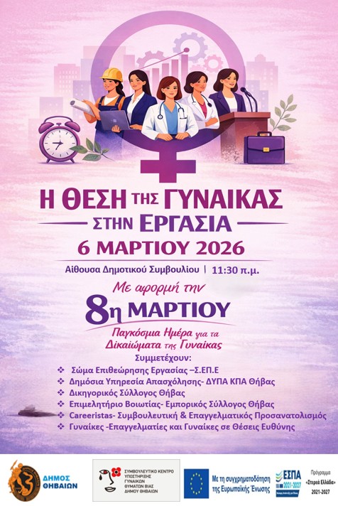 Με αφορμή την 8η Μαρτίου – Παγκόσμια Ημέρα για τα Δικαιώματα της Γυναίκας, ο Δήμος Θηβαίων και το Συμβουλευτικό Κέντρο Υποστήριξης Γυναικών διοργανώνουν δράσεις ενημέρωσης και ευαισθητοποίησης με στόχο την ανάδειξη της θέσης της γυναίκας και την προώθηση της ισότητας των φύλων.