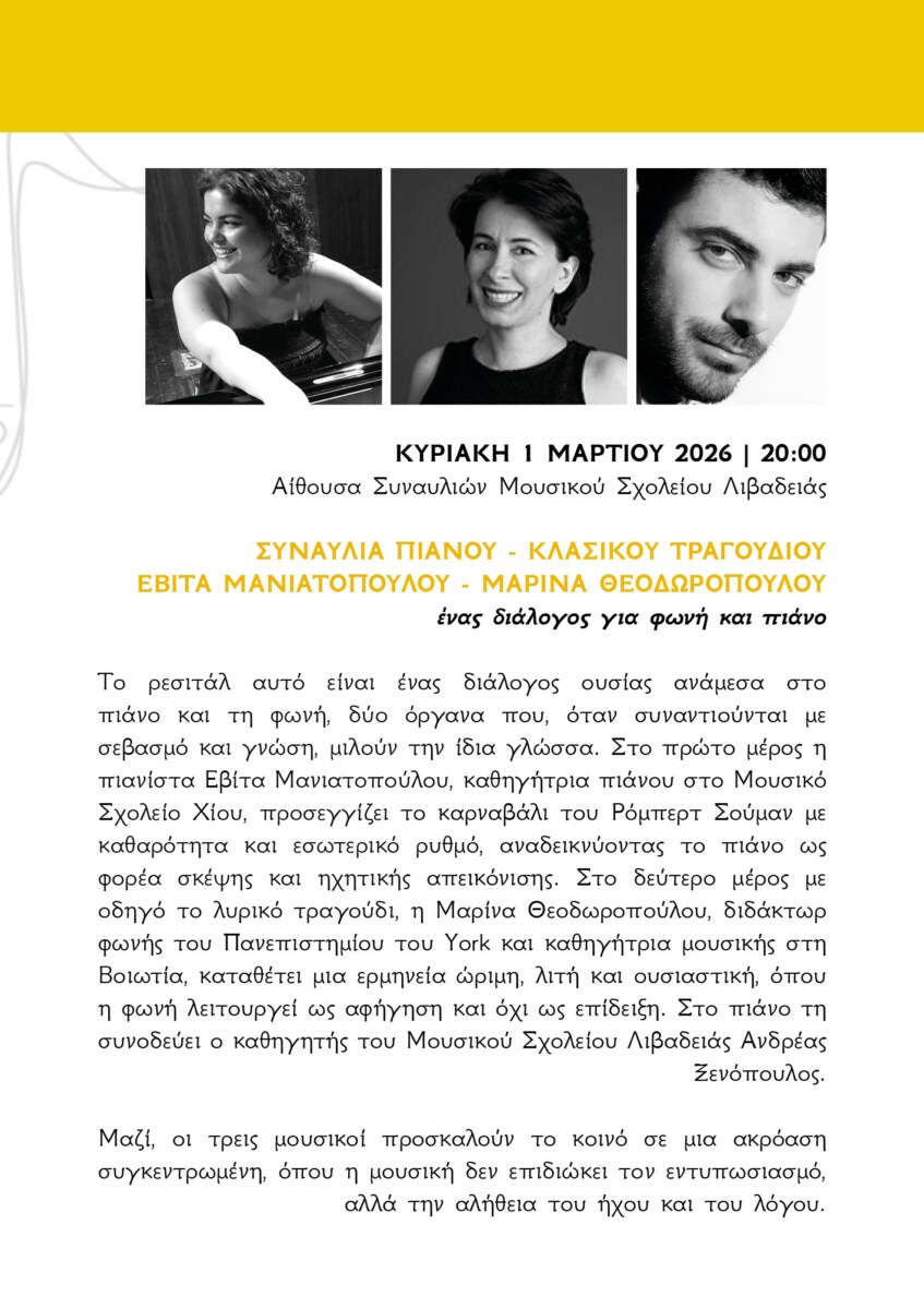Στη συνέχεια, η συναυλία στρέφεται στο τραγούδι, εκεί όπου ο λόγος και η μελωδία συναντιούνται. Ερμηνεύουν οι καθηγητές του τόπου μας. Η σοπράνο Μαρίνα Θεοδωροπούλου και ο πιανίστας και καθηγητής του Μουσικού Σχολείου Λιβαδειάς Ανδρέας Ξενόπουλος.