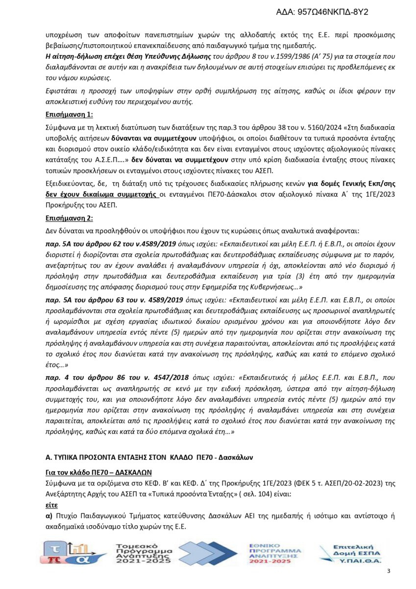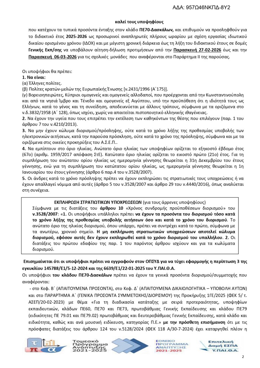Τοπική Πρόσκληση υποψηφίων εκπαιδευτικών για κάλυψη θέσεων κλάδου ΠΕ70-Δασκάλων, για δομές Γενικής Εκπαίδευσης