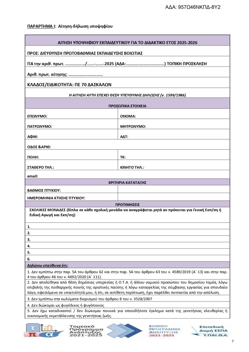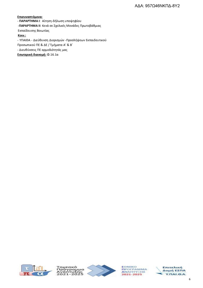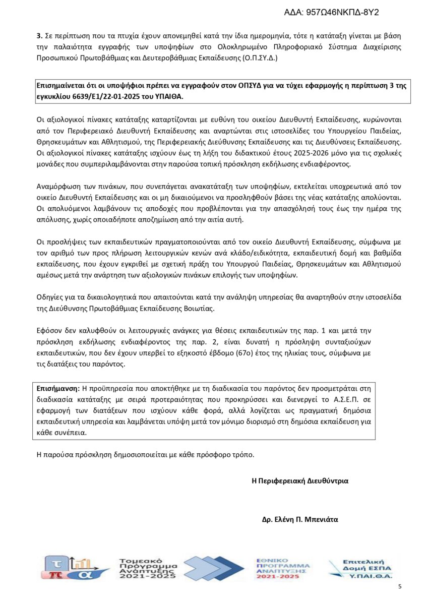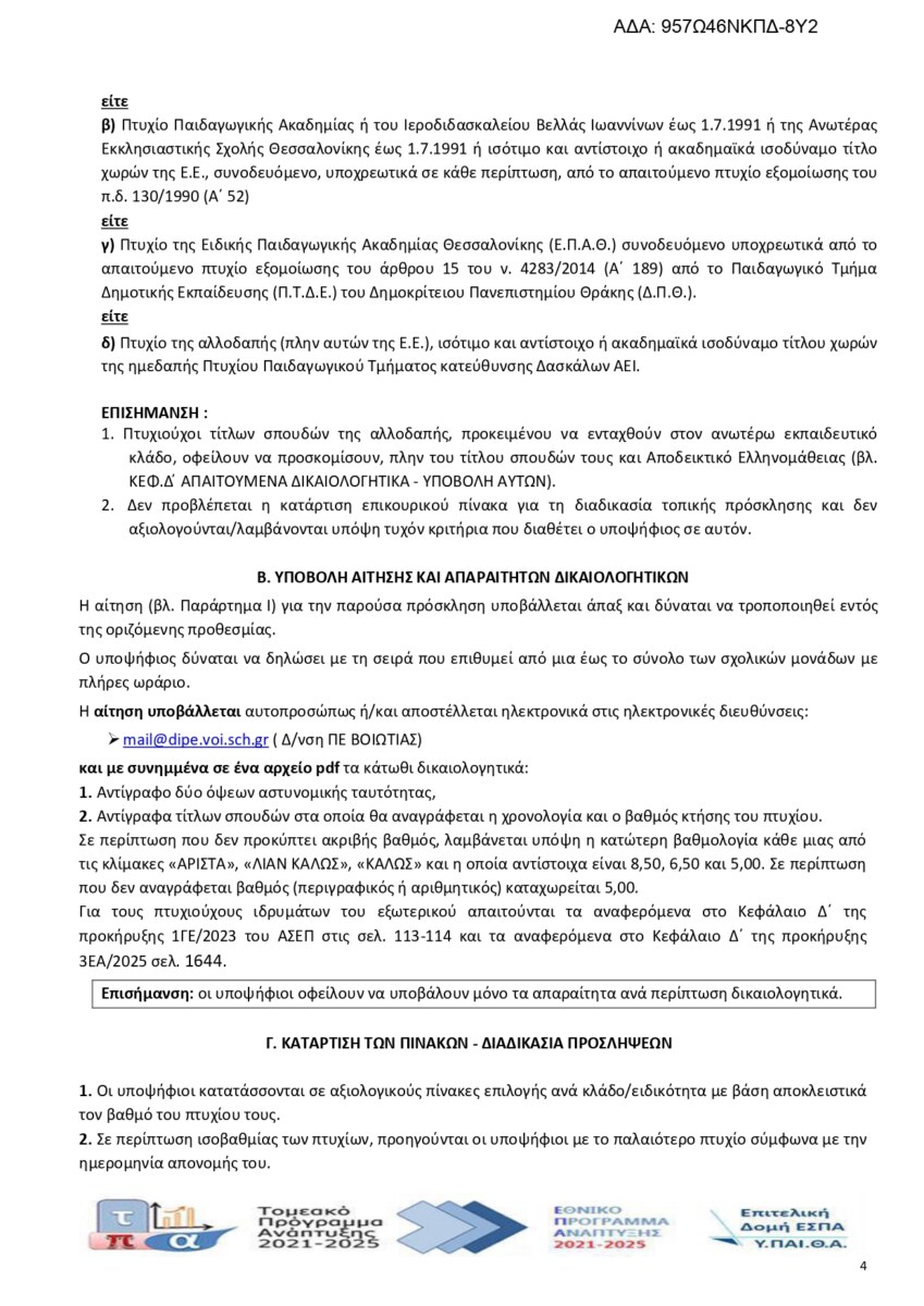 Τοπική Πρόσκληση υποψηφίων εκπαιδευτικών για κάλυψη θέσεων Δασκάλων, για δομές Γενικής Εκπαίδευσης σε σχολικές μονάδες Διευθύνσεων Πρωτοβάθμιας Εκπαίδευσης της Περιφερειακής Διεύθυνσης Εκπαίδευσης Στερεάς Ελλάδας για το διδακτικό έτος 2025-2026.