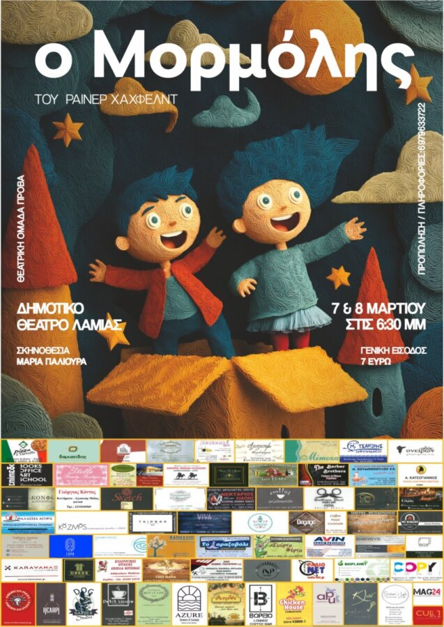 Η θεατρική ομάδα ‘’Πρόβα’’ θα παρουσιάσει στο Δημοτικό θέατρο Λαμίας το Σάββατο 7 & την Κυριακή 8 Μαρτίου στις 6.30 μμ την παιδική θεατρική παράσταση ‘’Ο Μορμόλης’’ του Ράινερ Χάχφελντ. Η Μάντα και ο Ρίκι τα δυο παιδιά της ιστορίας μας περνούν τις διακοπές τους κοντά στον θείο Αγησίλαο και την θεία Πολυξένη.