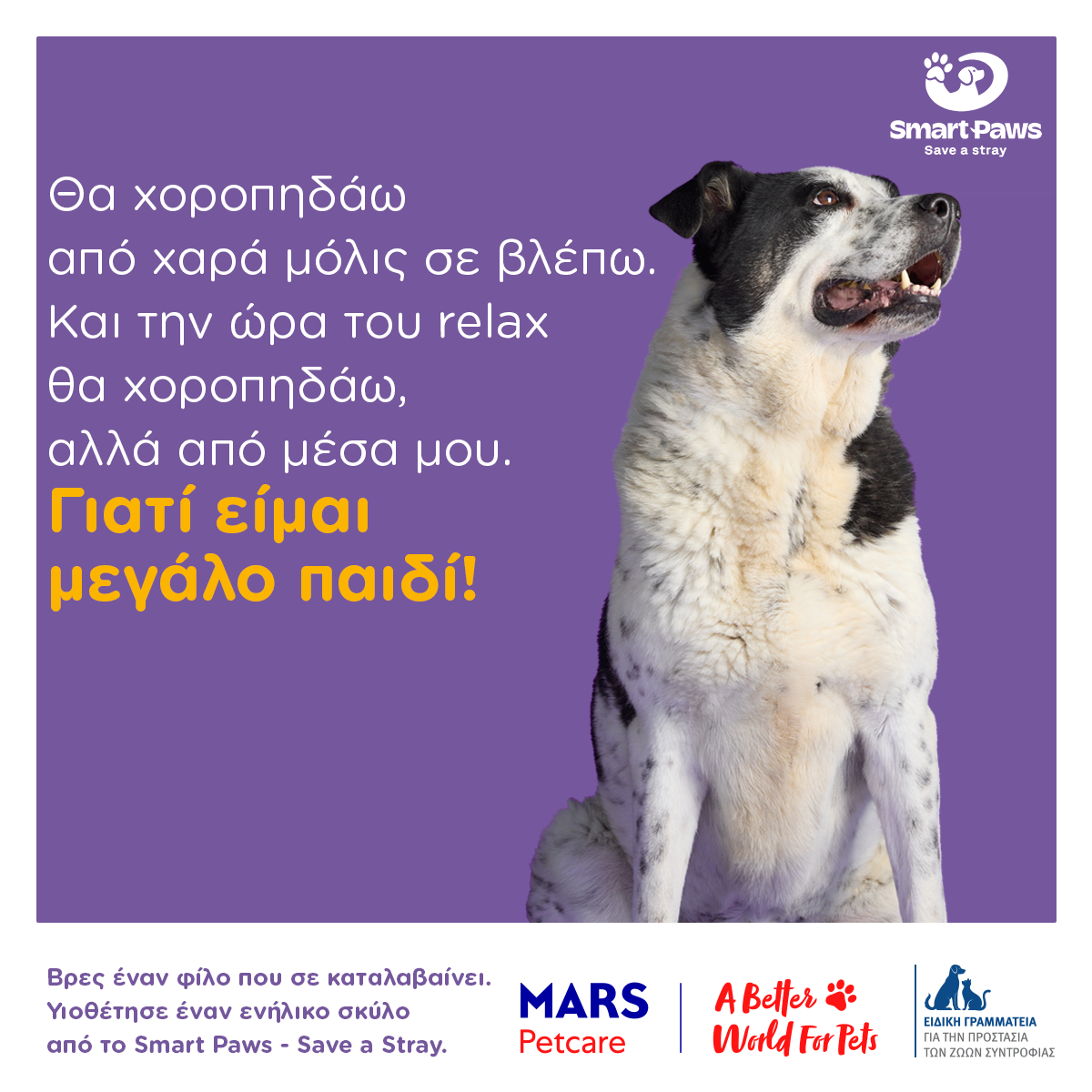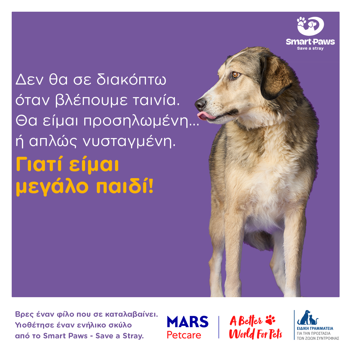 -Η καμπάνια δεν προσεγγίζει γενικά το ζήτημα της υιοθεσίας. Εστιάζει αποκλειστικά στα ενήλικα σκυλιά, ζώα που συχνά παραμένουν για χρόνια «αόρατα» στα καταφύγια, παρότι είναι κοινωνικοποιημένα, ισορροπημένα και απολύτως έτοιμα να ενταχθούν σε ένα οικογενειακό περιβάλλον.