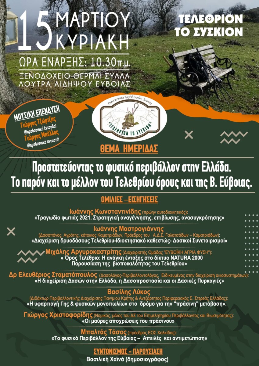 Η «Περιπατητική Σχολή Β. Ευβοίας ΤΕΛΕΘΡΙΟΝ ΤΟ ΣΥΣΚΙΟΝ», σας προσκαλεί στην Ημερίδα με θέμα: «Προστατεύοντας το φυσικό περιβάλλον στην Ελλάδα – Το παρόν και το μέλλον του Τελεθρίου όρους και της Β. Εύβοιας»