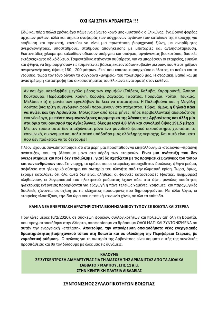 3. Να καλέσουμε τα μέλη μας στην Συγκέντρωση Διαμαρτυρίας για τη σωτηρία της Αρβανίτσας στην Κεντρική πλατεία Λιβαδειάς το Σάββατο 7 Μάρτη στις 11.00πμ