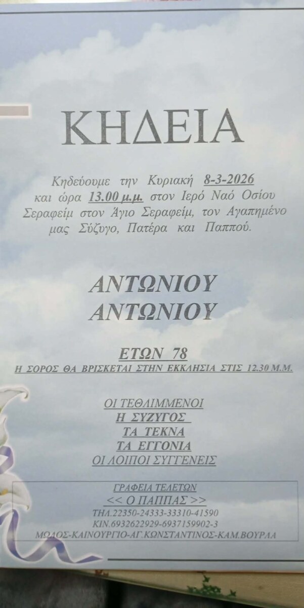 Συγγενείς και φίλοι θα πουν το τελευταίο αντίο στον Αντώνη Αντωνίου στον Ιερό Ναό του Οσίου Σεραφείμ σήμερα στην μία μετά το μεσημέρι.