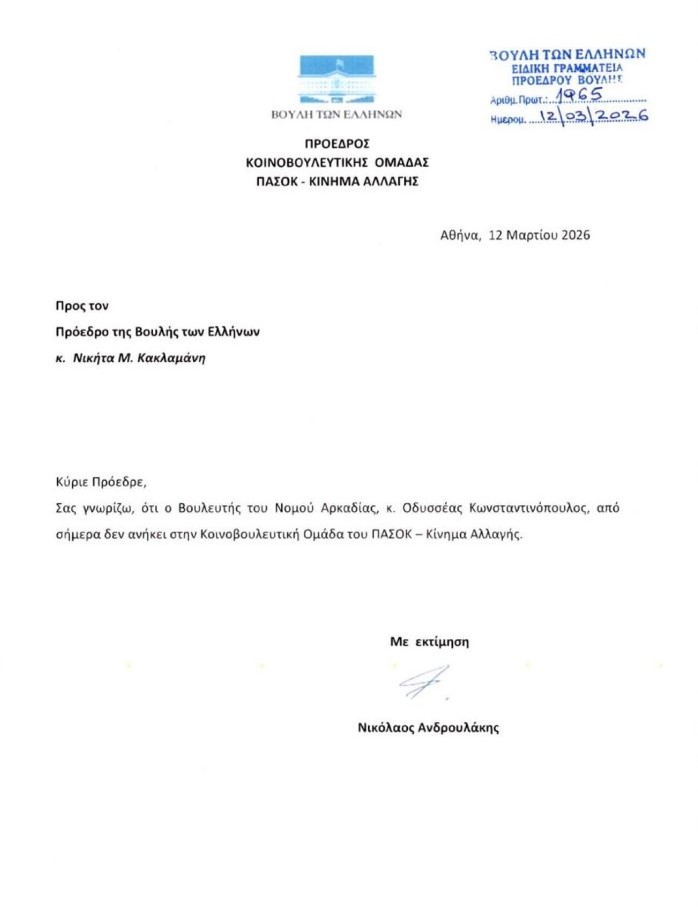 Στη διαγραφή από την ΚΟ του ΠΑΣΟΚ Οδυσσέα Κωνσταντινόπουλου προχώρησε ο Νίκος Ανδρουλάκης, όπως γνωστοποίησε με επιστολή του στον πρόεδρο της Βουλής.