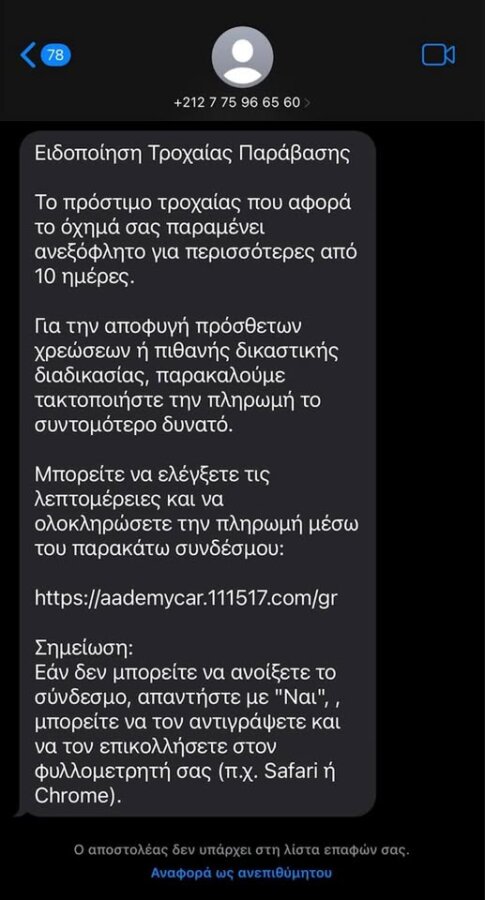 “Το πρόστιμο τροχαίας που αφορά το όχημά σας παραμένει ανεξόφλητο για περισσότερο από 10 ημέρες. Για αποφυγή πρόσθετων χρεώσεων ή πιθανής δικαστικής διαδικασίας παρακαλούμε τακτοποιήστε την πληρωμή το συντομότερο δυνατόν.”, αναφέρεται στο μήνυμα.