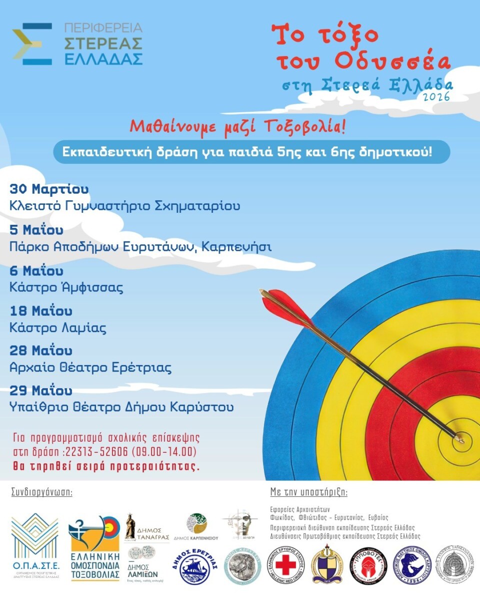 Η Περιφέρεια Στερεάς Ελλάδας συμπράττει με την Ελληνική Ομοσπονδία Τοξοβολίας και διοργανώνει τη δράση: «Το τόξο του Οδυσσέα» με στόχο την ανάδειξη του αθλήματος της τοξοβολίας.