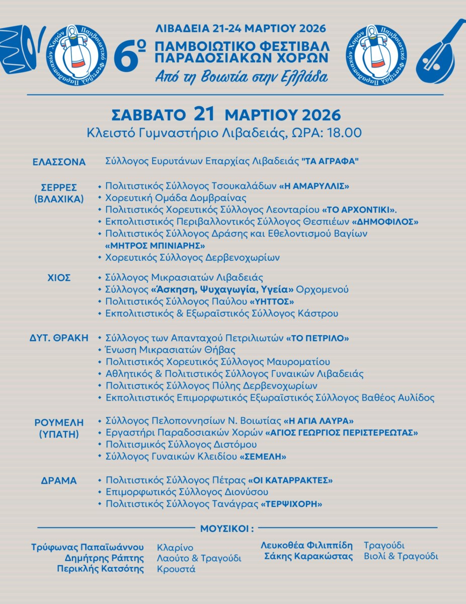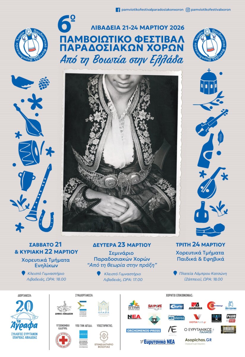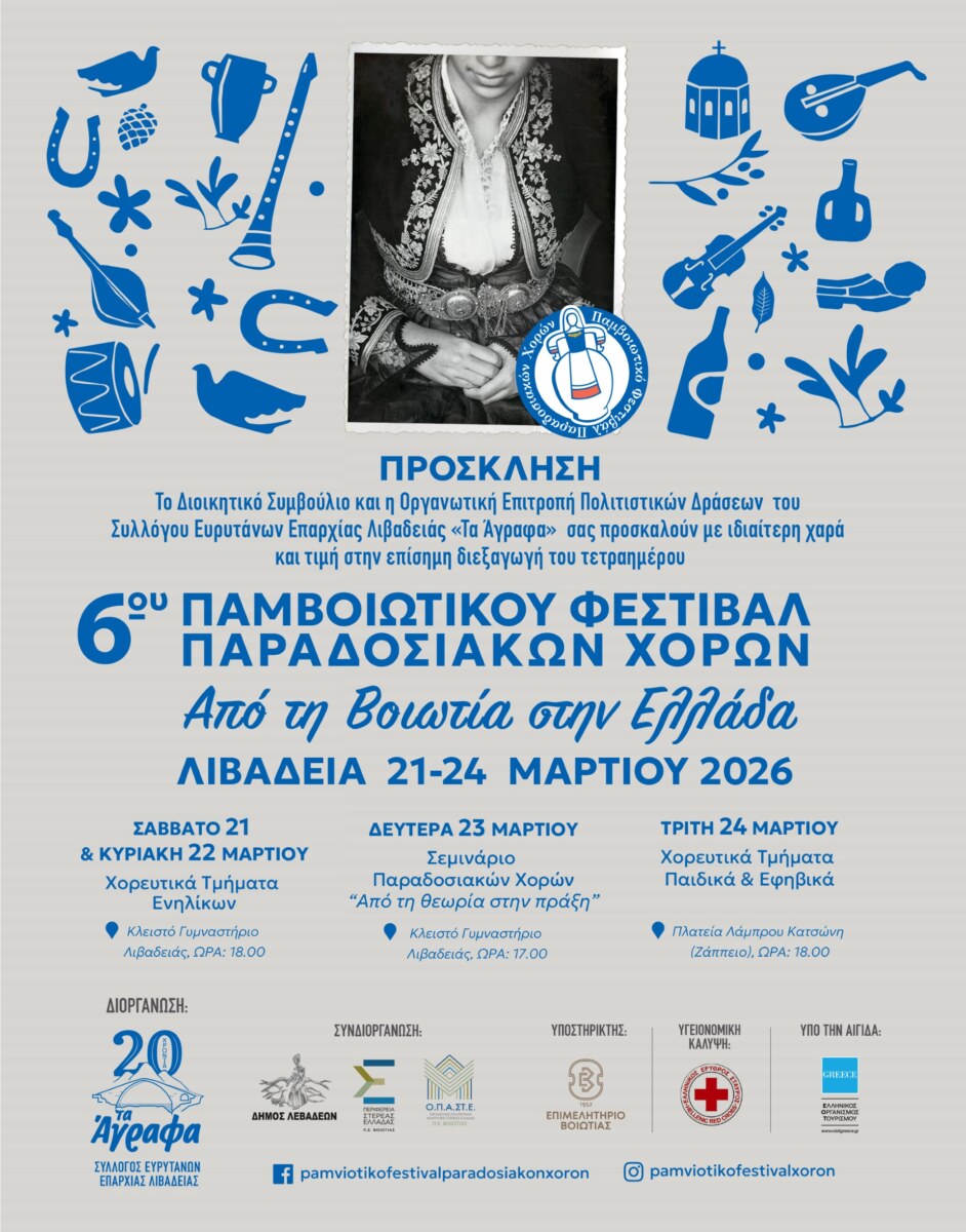 Ο Σύλλογος Ευρυτάνων Επαρχίας Λιβαδειάς «Τα Άγραφα» διοργανώνει για έκτη συνεχόμενη χρονιά το Παμβοιωτικό Φεστιβάλ Παραδοσιακών Χορών, το οποίο θα πραγματοποιηθεί στη Λιβαδειά από 21 έως 24 Μαρτίου 2026, με κεντρικό τίτλο «Από τη Βοιωτία στην Ελλάδα».