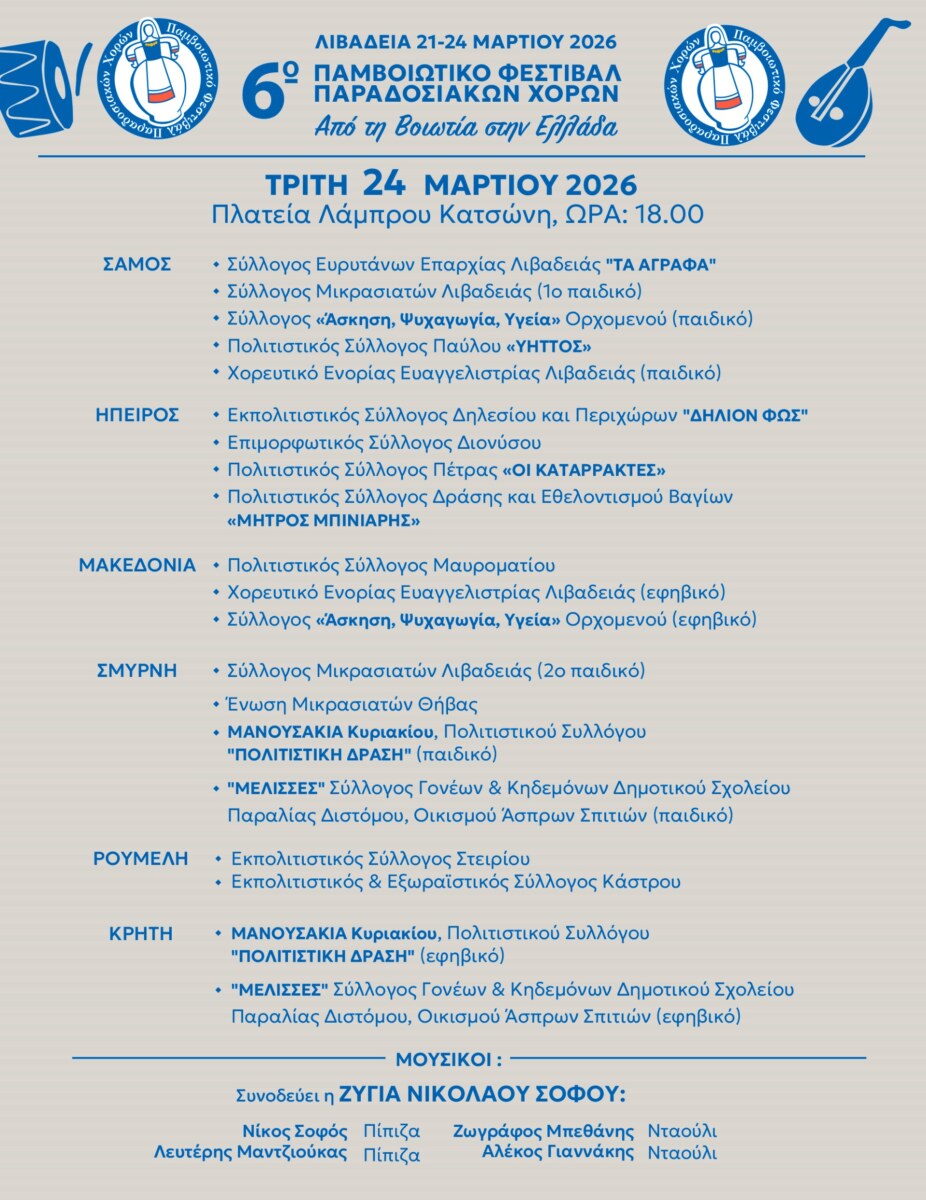 Η Λιβαδειά στο επίκεντρο της ελληνικής παράδοσης. Από τη Βοιωτία σε όλη την Ελλάδα, το 6ο Παμβοιωτικό Φεστιβάλ Παραδοσιακών Χορών (21–24 Μαρτίου 2026)