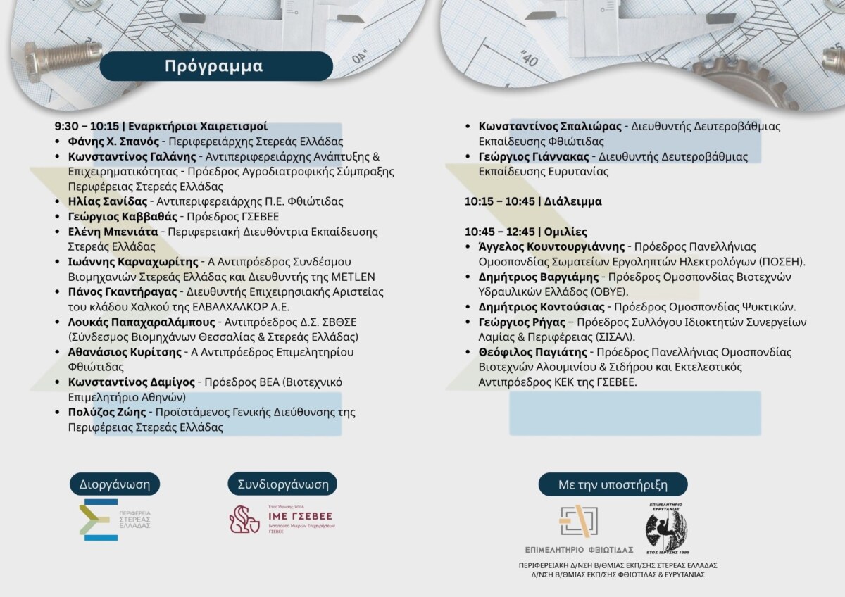 Η Περιφέρεια Στερεάς Ελλάδας και το ΙΜΕ ΓΣΕΒΕΕ σε συνεργασία με το Επιμελητήριο Φθιώτιδας, το Επιμελητήριο Ευρυτανίας, τη Δ/νση Β/θμιας Εκπ/σης Φθιώτιδας & Ευρυτανίας & την Περιφερειακή Δ/νση Β/θμιας Εκπ/σης Στερεάς Ελλάδας, διοργανώνουν ενημερωτική ημερίδα με θέμα «Στερεά Ελλάδα: Τα Τεχνικά Επαγγέλματα, η βάση του μέλλοντος».