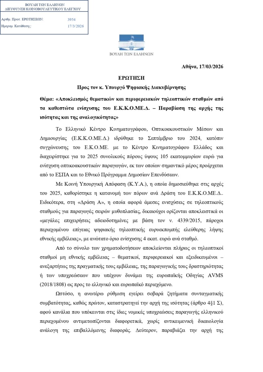 Όπως επισημαίνεται στο κείμενο της κοινοβουλευτικής παρέμβασης, το Ε.Κ.Κ.Ο.ΜΕ.Δ., το οποίο ιδρύθηκε το 2024 μέσω συγχώνευσης υφιστάμενων φορέων, διαχειρίστηκε για το έτος 2025 οικονομικούς πόρους, ύψους 105 εκατομμυρίων ευρώ για την ενίσχυση οπτικοακουστικών παραγωγών, με τη χρηματοδότηση να προέρχεται από το ΕΣΠΑ και το Πρόγραμμα Δημοσίων Επενδύσεων. Ωστόσο, η κατανομή των πόρων, όπως καθορίστηκε με Κοινή Υπουργική Απόφαση στις αρχές του 2025, έχει προκαλέσει έντονες και δίκαιες αντιδράσεις.