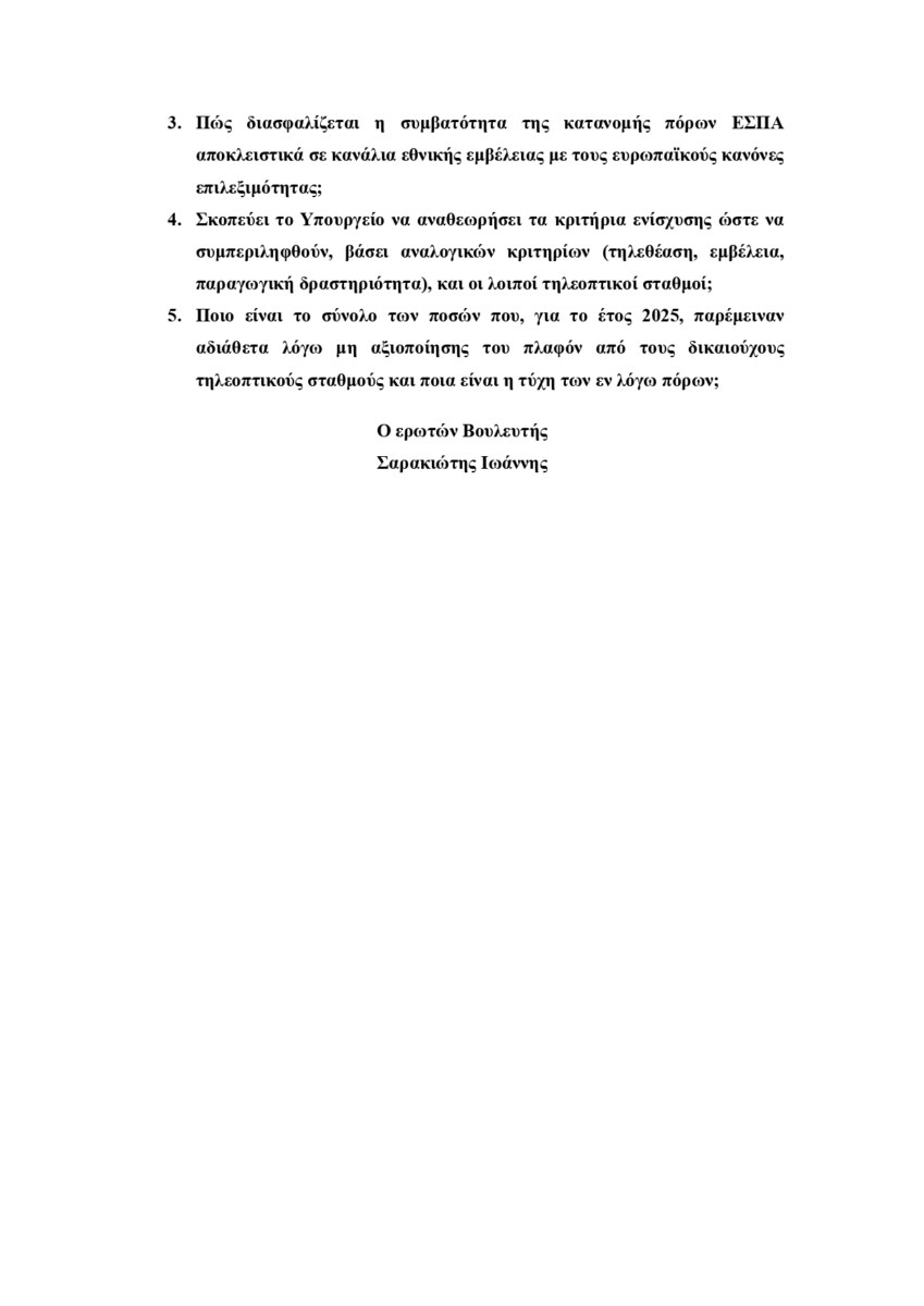 Στην ερώτησή του, ο κ. Σαρακιώτης ζητά απαντήσεις για τον αποκλεισμό των περιφερειακών σταθμών, για το εάν εξετάστηκε η συνταγματικότητα της σχετικής απόφασης, για τη συμβατότητα με τους κανόνες της Ευρωπαϊκής Ένωσης και ζητά την αναθεώρηση των κριτηρίων ενίσχυσης. Παράλληλα, ζητά στοιχεία για τυχόν αδιάθετους πόρους που δεν αξιοποιήθηκαν από τους υφιστάμενους δικαιούχους. Σε δήλωσή του, ο Βουλευτής Φθιώτιδας, Γιάννης Σαρακιώτης, τονίζει: