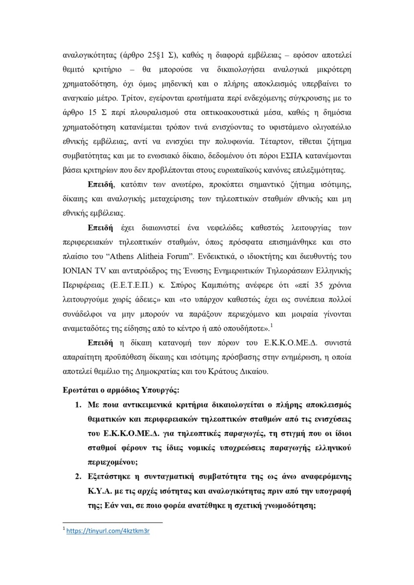 Ιδιαίτερη αναφορά γίνεται και στο ζήτημα του πλουραλισμού στα μέσα ενημέρωσης, με τον Βουλευτή Φθιώτιδας να υπογραμμίζει ότι η συγκεκριμένη κατανομή ενισχύει περαιτέρω τη συγκέντρωση της αγοράς σε λίγους μεγάλους παίκτες, αντί να ενδυναμώνει τη φωνή της περιφέρειας και τη δημοκρατική πολυφωνία. Επιπλέον, τίθεται και ζήτημα συμβατότητας με το ευρωπαϊκό δίκαιο, δεδομένου ότι πόροι του ΕΣΠΑ κατανέμονται με κριτήρια που δεν εδράζονται σε σαφείς ευρωπαϊκές προδιαγραφές.