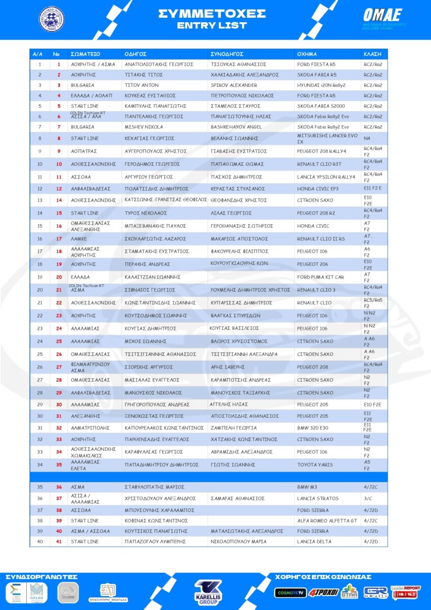 Εκμεταλλευόμενοι την εμπειρία τους από τις ειδικές διαδρομές της περιοχής, οι Ανδρέας Γρηγορόπουλος-Ηλίας Αγγελής θα ριχτούν στη μάχη με το χρονόμετρο με ένα Peugeot 205, ενώ με ίδιο αυτοκίνητο θα αγωνιστούν στην F2 E οι Γιώργος Ξενοκώστας-Αθανάσιος Αποστολίδης. Με μία BMW 320 E30 θα συμμετάσχουν στην πρεμιέρα του Πανελληνίου Πρωταθλήματος Ράλλυ Ασφάλτου οι Κωνσταντίνος Καπουρελάκος-Γεωργία Ζαμπέλη.