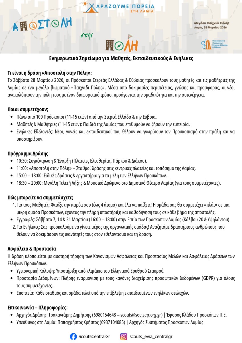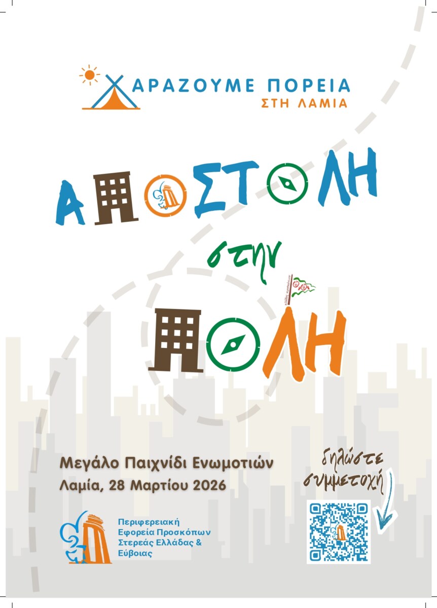 Η Περιφερειακή Εφορεία Προσκόπων Στερεάς Ελλάδας & Εύβοιας σας προσκαλεί σε μια ξεχωριστή εθελοντική δράση με τίτλο «Αποστολή στην Πόλη», που θα πραγματοποιηθεί το Σάββατο 28 Μαρτίου 2026.