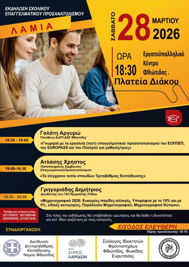 Η Διεύθυνση Δευτεροβάθμιας Εκπαίδευσης Νομού Φθιώτιδας, ο Δήμος Λαμιέων, ο Σύλλογος Ιδιοκτητών Φροντιστηρίων Φθιώτιδας, Φωκίδας και Ευρυτανίας και ο Εξωραϊστικός Σύλλογος “Η Νέα Βράχα”, αναγνωρίζοντας την ανάγκη για συνεχή ενημέρωση μαθητών/τριών και γονέων σχετικά με θέματα επαγγελματικού προσανατολισμού, διοργανώνουν εκδήλωση το Σάββατο 28 Μαρτίου 2026 στις 18:30 στο «Εργατοϋπαλληλικό Κέντρο Φθιώτιδας» στην πλατεία Διάκου.