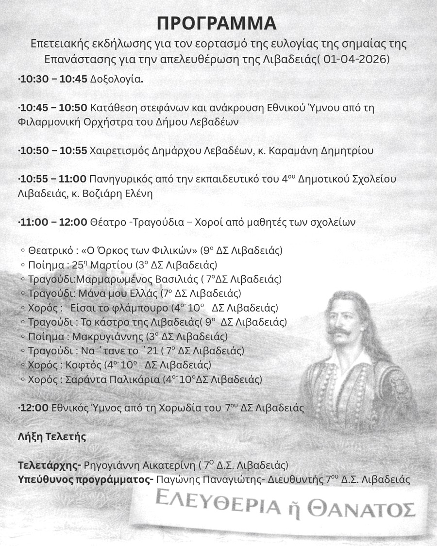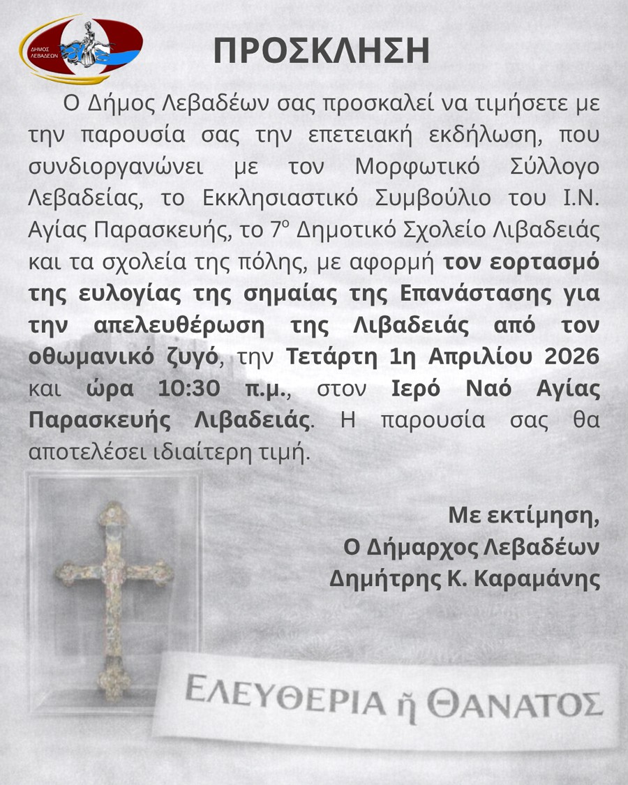 Ο Δήμος Λεβαδέων, ο Μορφωτικός Σύλλογος Λεβαδείας, το Εκκλησιαστικό Συμβούλιο του Ι.Ν. Αγίας Παρασκευής, το 7ο Δημοτικό Σχολείο Λιβαδειάς και τα σχολεία της πόλης, διοργανώνουν επετειακή εκδήλωση, με αφορμή τον εορτασμό της ευλογίας της σημαίας της Επανάστασης για την απελευθέρωση της Λιβαδειάς.