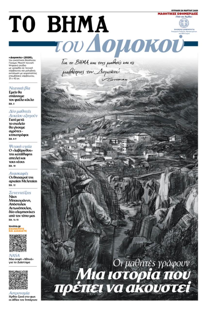 Μια ξεχωριστή εκδοτική στιγμή περιμένει το αναγνωστικό κοινό αυτή την Κυριακή, 29 Μαρτίου 2026. Οι μαθήτριες και οι μαθητές του Γενικού Λυκείου (ΓΕΛ) Δομοκού παίρνουν την πένα στα χέρια τους και συστήνονται στο πανελλήνιο, καθώς «Το ΒΗΜΑ του Δομοκού», κυκλοφορεί ως ένθετο μαζί με την εφημερίδα «Το ΒΗΜΑ της Κυριακής».