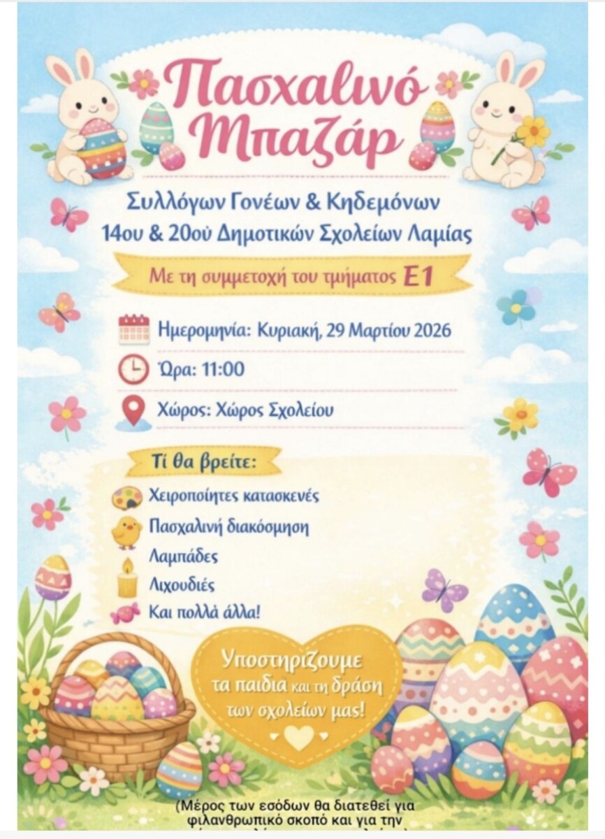 Οι Σύλλογοι Γονέων και Κηδεμόνων 14ου και 20ού Δημοτικών Σχολείων Λαμίας διοργανώνουν πασχαλινό μπαζάρ με χειροποίητες δημιουργίες στον χώρο του σχολείου.