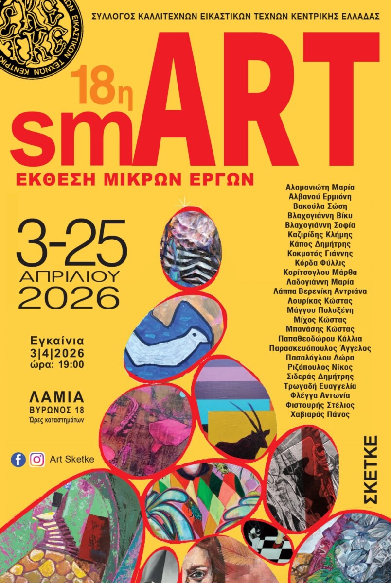 Ο Σύλλογός Καλλιτεχνών Εικαστικών Τεχνών Κεντρικής Ελλάδας. έχει τη χαρά να ανακοινώσει τη διοργάνωση της 18ης Έκθεσης “smART”, μιας καθιερωμένης πλέον εικαστικής συνάντησης αφιερωμένης στα έργα μικρής διάστασης, που θα πραγματοποιηθεί από τις 3 έως τις 25 Απριλίου 2026, στην καρδιά της Λαμίας.