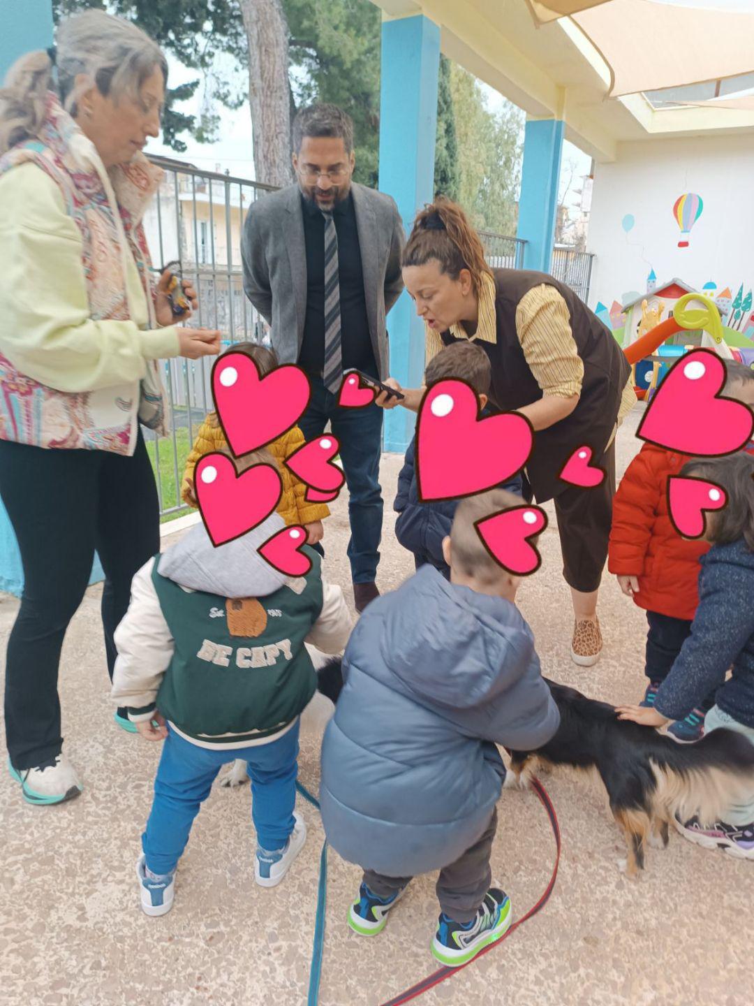 Τα παιδιά μαζί με τις Παιδαγωγούς , με χαρά και ενθουσιασμό υποδέχθηκαν και γνώρισαν δύο καινούργιους φίλους, δύο όμορφα και χαριτωμένα σκυλάκια τον «ΜΙΜΗ» & την «ΣΤΕΦΗ» που τα τάϊσαν με την ειδική τροφή και έπαιξαν μαζί τους .