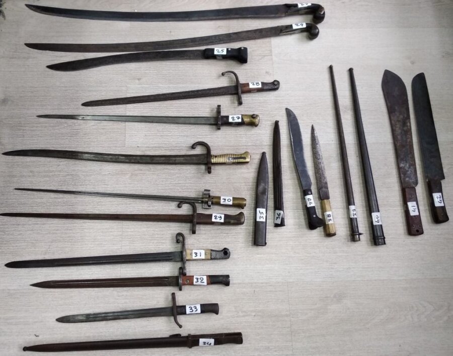 Στο κατάστημα ιδιοκτήτη ινδικής καταγωγής που απουσίαζε κατά τη διάρκεια του ελέγχου, σε ντουλάπια πίσω από το ταμείο της επιχείρησης βρέθηκαν και κατασχέθηκαν 7 σπαθιά 96 εκατοστών και 8 μαχαίρια 23 εκατοστών.