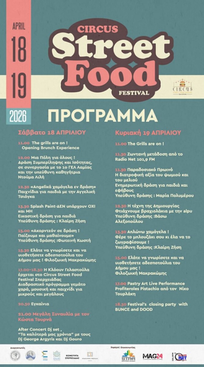 Ο Δήμος Μακρακώμης, ο Εμπορικός και Βιοτεχνικός Σύλλογος Σπερχειάδας και η Κοινότητα Σπερχειάδας σας προσκαλούν στο “Circus Street Food Festival 2026”, το οποίο θα πραγματοποιηθεί αυτό το Σαββατοκύριακο, 18 και 19 Απριλίου, στην Κεντρική Πλατεία Σπερχειάδας (Αθανασίου Ακρίδα).