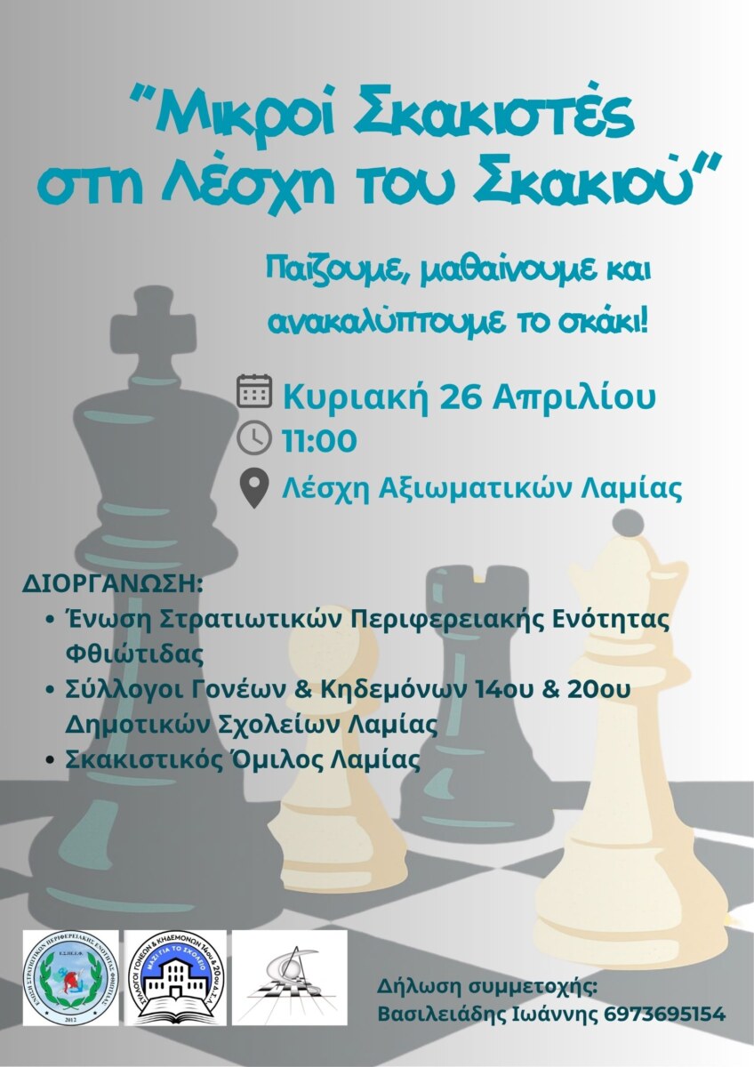 Η Ένωση Στρατιωτικών Περιφερειακής Ενότητας Φθιώτιδας (Ε.Σ.ΠΕ.Ε.Φ.), στο πλαίσιο των κοινωνικών και πολιτιστικών της δράσεων, ανακοινώνει με χαρά τη συνδιοργάνωση της παιδικής εκδήλωσης «Μικροί Σκακιστές στη Λέσχη του Σκακιού».