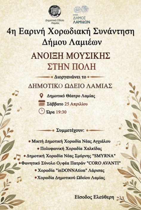 Ο Δήμος Λαμιέων και το Δημοτικό Ωδείο Δήμου Λαμιέων διοργανώνουν την 4η Εαρινή Χορωδιακή Συνάντηση, το Σάββατο 25 Απριλίου και ώρα 19:30, στο Δημοτικό Θέατρο Λαμίας.
